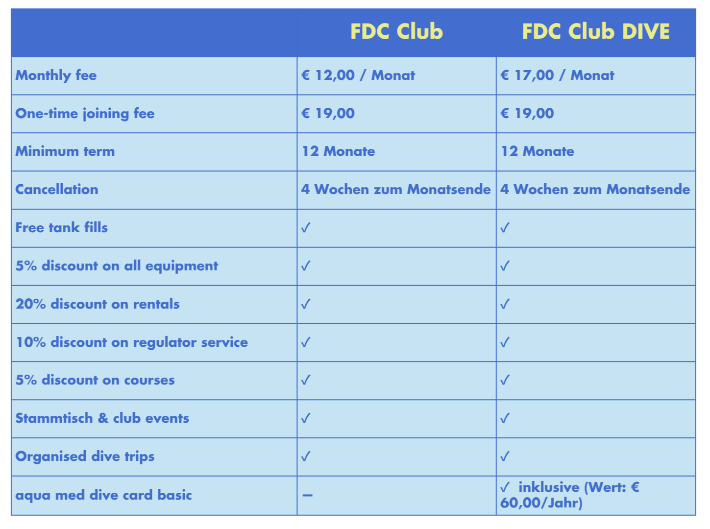 Nur im FDC Club DIVE. Der Jahresbeitrag von € 60,00 für die aqua med dive card basic ist in deinem monatlichen Beitrag von € 17,00 enthalten – du musst nichts weiter tun.